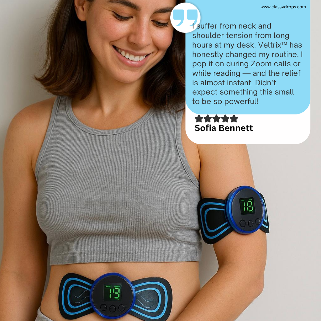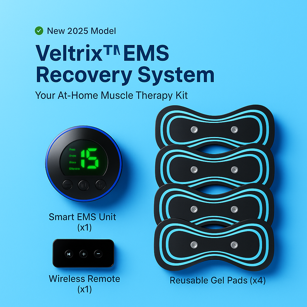 Veltrix™ sends smart electrical pulses through skin-friendly gel pads to stimulate muscles and increase blood flow — helping release tension, reduce soreness, and improve recovery speed.